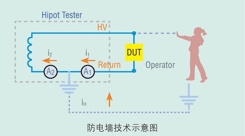 常州致新ZX9501系列耐壓機具有GFI防電墻功能來保護測試人員(原理如圖所示)。在突發人體感電的情形下,GFI能立即切斷儀器的電壓輸出,保護操作員不受電氣傷害。GFI功能偵測從地端(Earth GND)流回的電流iH與低端電流iL,比較后若大于0.5mA,則會立即切斷高壓輸出。