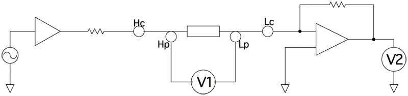 作為LCR測試儀的測量回路,較多采用的回路方式之一就是"自動平衡電橋法"。有Hc、Hp、Lp、Lc的4端子,并將所有端子連接被測物。回路概略和各端子的功能請參考如下內容。
