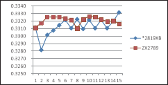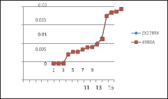 測(cè)試速度快了,還必須保證測(cè)量數(shù)據(jù)的穩(wěn)定性,左圖是兩種不同的機(jī)型,大家都用各自的最快測(cè)試速度,掃描測(cè)試同一個(gè)網(wǎng)絡(luò)變壓器同一個(gè)繞組的漏感15次的測(cè)量數(shù)據(jù)分布圖,我們可以看到,ZX2789的測(cè)量數(shù)據(jù)的一致性要略好一些。